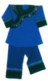 ,外套青色滿肩馬褂,腰系桃花兜,并配撤穗荷包,下著青色寬腳褲,腳穿白布襪子和天官云頭鞋。婦女頭上蒙白色繡花帕,兩耳垂環(huán),手戴鐲子或戒指,外套繡花圍裙,用繡花飄帶系著,右上胸佩掛三吊或五吊銀質(zhì)牙簽。下著蘭色寬褲,腳纏白色裹腳布,穿繡花尖尖鞋。無婚女性則挽“簪巴”,挽于腦后的稱“粑粑”,挽于頭頂?shù)姆Q高把簪,簪上套有網(wǎng),橫插簪子;兒童衣服多繡花,外圍肚兜,頭戴虎頭鼓針菩薩帽,頸戴“項圈”、“百家鎖”等,手腕套有銀圈,上系小吊,吊上有錘、鈴、鞋、斧、簽等。