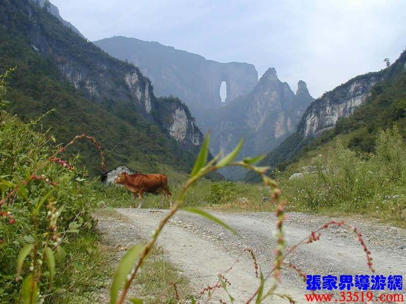 (俯視天門)站在這里可以俯視面向北面的天門洞,以及天門山公司正在修建的通天大道。1999年11月世飛賽期間,中央電視臺(tái)6號(hào)機(jī)組正是在這里拍攝飛機(jī)穿越天門驚人場(chǎng)面的。這兒距天門洞垂直高度200多米。