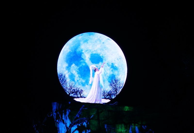 本項目舞臺及舞美設(shè)施為目前世界范圍內(nèi)的實景演出中投資最多、舞臺機(jī)械裝置最為復(fù)雜且規(guī)模最大、燈光設(shè)施數(shù)量最多且分布范圍最大的,另外主舞臺也是世界最大的全景玻璃鋼舞臺(10000平方米)。舞臺機(jī)械設(shè)施中,尤其是跨度60米、高度32米的伸縮飛橋,是目前世界范圍的演出項目中絕無僅有的大型舞臺機(jī)械裝置。燈光數(shù)量:大型燈光1100盞,中小型燈光2800盞;演出音響為專門定制的美國EAW音戶外防雨、防潮音響設(shè)備,也是目前國內(nèi)演出項目中投資最大的。