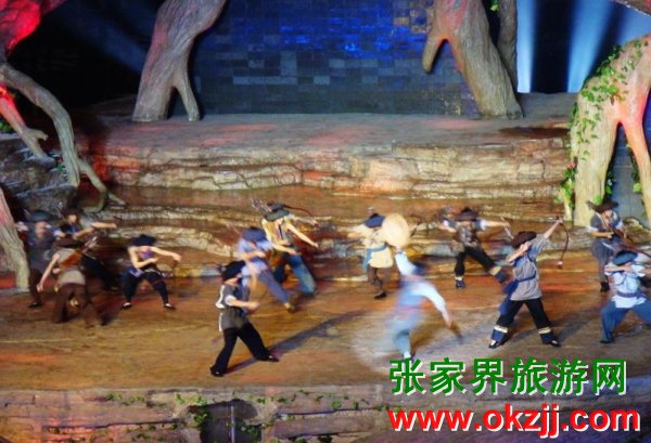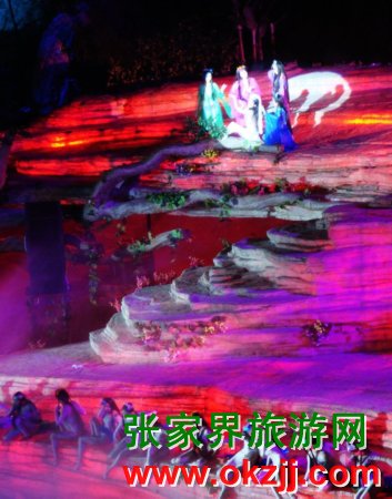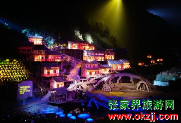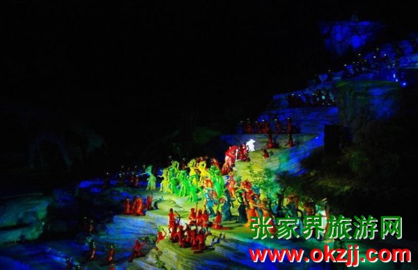 是目前世界第一臺有完整故事情節(jié)的山水實景音樂歌舞劇。舞臺選址在天門山風(fēng)景區(qū)山門口內(nèi)至天門山頂?shù)恼麠l峽谷,總投資達(dá)到1.2億元,演員隊伍達(dá)530多人。主舞臺以10000平米的玻璃鋼打造,是目前世界最大的全景玻璃鋼舞臺。