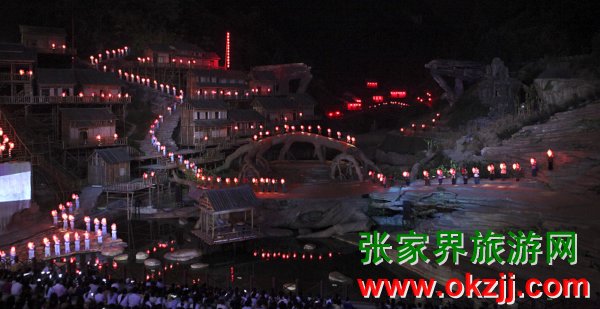 在天門山景區(qū)全球最大的玻璃鋼舞臺上,在開幕式上試演的世界第一臺大型山水實景音樂劇《天門狐仙》,拉開了’2009中國湖南國際旅游節(jié)張家界民族文化周的序幕。
