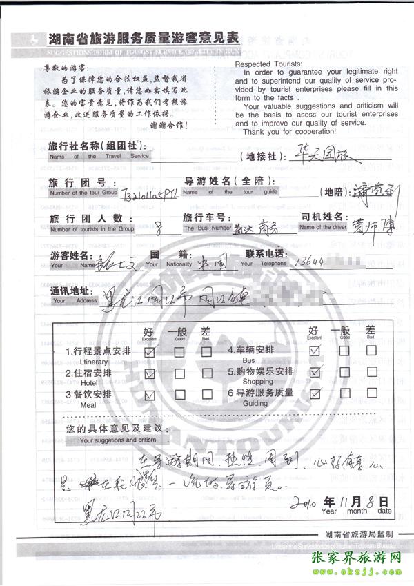 2010年11月8日張先生旅游質(zhì)量反饋