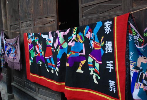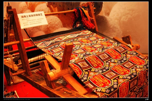 土家織錦在境域民間主要用于被面及小孩用的窩窩被、腳被、蓋裙,亦是姑娘陪嫁、定情及民俗活動跳擺手舞時的披甲和祭祀用于堂前的壁掛。土家錦的圖案主要源于生活,已知名的達(dá)100余種,大致分為6大類:動物題材有馬畢(小馬)、石畢(小動物)、陽雀花、燕子花、大龍紋、小龍紋、蛇花、貓腳跡、風(fēng)紋、蝴蝶牡丹和老鼠嫁女等;植物題材有蓮花、韭菜花、九朵梅、巖墻花、大刺花、藤藤花等;日常用具題材有椅子花、桌子花、箱子八勾、豆腐架、桶桶花、船船花、鋸齒花、梭子花、背簍花等;抽象幾何勾狀紋有單八勾、雙八勾、四十八勾、十二勾、二十四勾及勾紋變種紋飾;以吉祥文字表現(xiàn)的有福祿壽喜、萬字流水、一品當(dāng)朝及田字紋、壽字紋等;取材天象的有太陽花、整月花、半月花、梭羅花、滿天星等。 土家錦的織造方式,歷代沿用自漢代以來的腰機(jī)式斜織機(jī)。民間織機(jī)一般長約5尺,寬約2尺多,高約3尺。所用材料,為蠶絲或棉線,用棉葉、棉梗、茜草、土靛、紫莓、土紅、黃珠子等物染色。