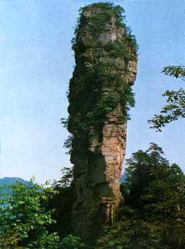 [南天一柱] 過南天門120米,東南幽谷峰林中有一高達200多米的孤峰,宛如擎天玉柱。上部灌木點綴,中部巖身赤裸,下部樹木遮掩,峰體渾圓、偉岸,因立南天門下而得名。